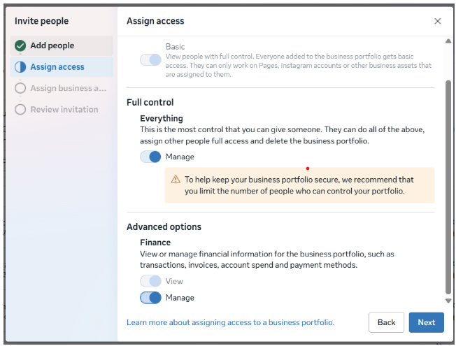 - Now you will see a new box where you can see different types of access. ***Make sure you enable the “Everything” tab available in the “Full Control” section and “Manage” tab of the “Finance” section too for yourself.***