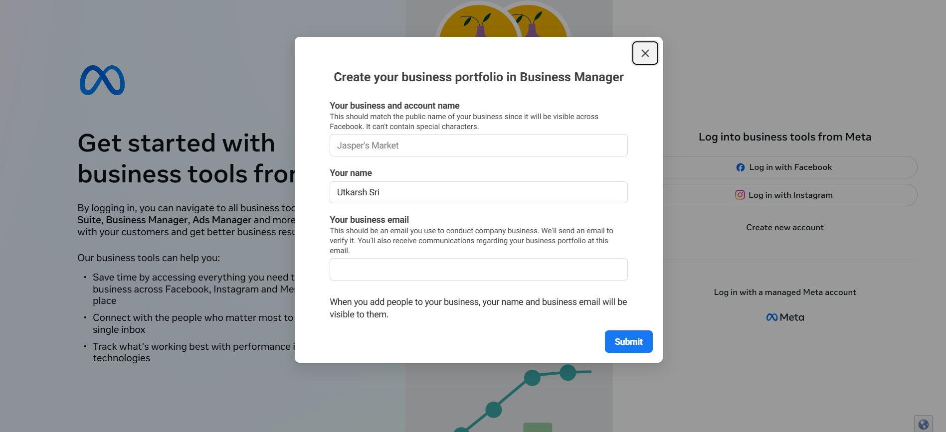 - Enter a name for your business, your name, and your email address, and Submit.