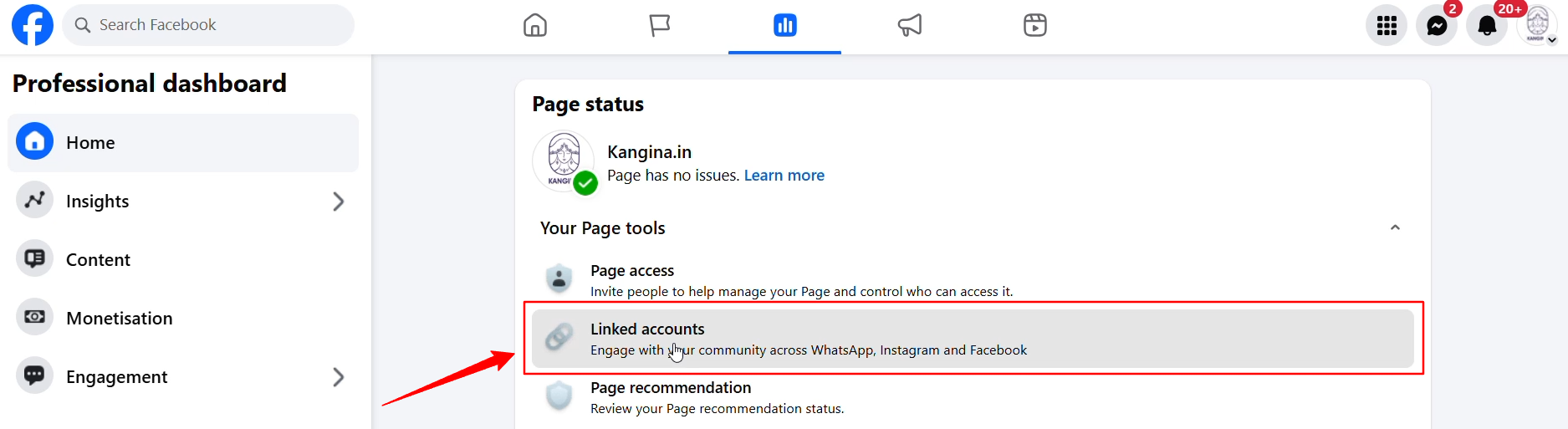 Log in to your personal Facebook account and Go to your Facebook Page Eg.https://www.facebook.com/kangina.in/- Select Page: Click on Professional Dashboard