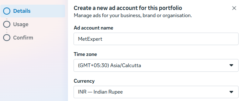 - Now a pop-up box will appear where you need to add “Ad account name”, and choose Time zone & Currency.