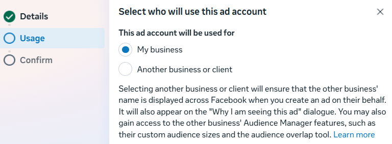 - In the next screen confirm the Ad account creation.