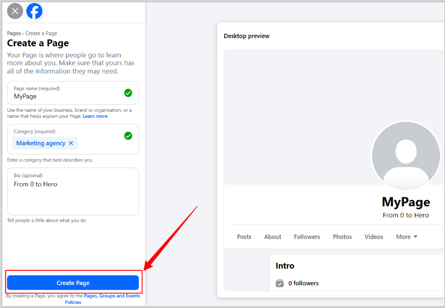 - Add “Page name” and “Category” that best describes your facebook page.