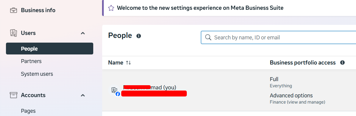 - Then select your BM (Business Manager) and you will be redirected to the Business Setting.