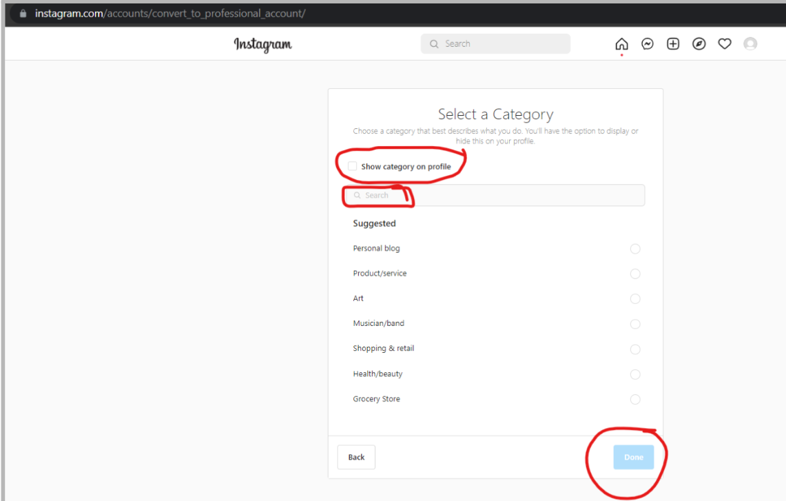 - Search for the relevant business category and check the box of “show category on profile” tab.. and then save..