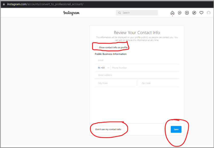 - B – Or else, add the contact information and tick the box “Show contact info on profile” and then save…You are all set…