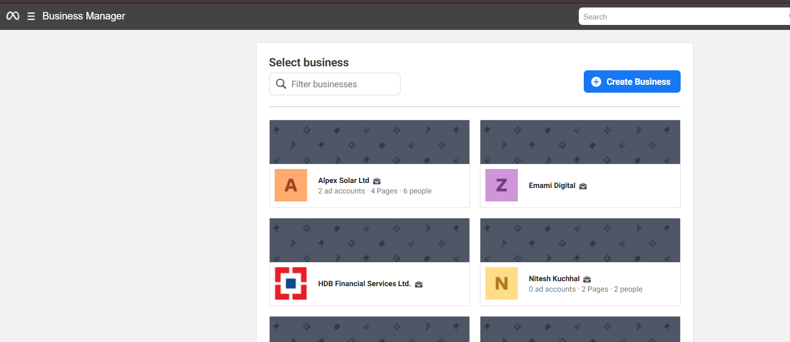 - Find the existing Business Manager by going to https://business.facebook.com/select